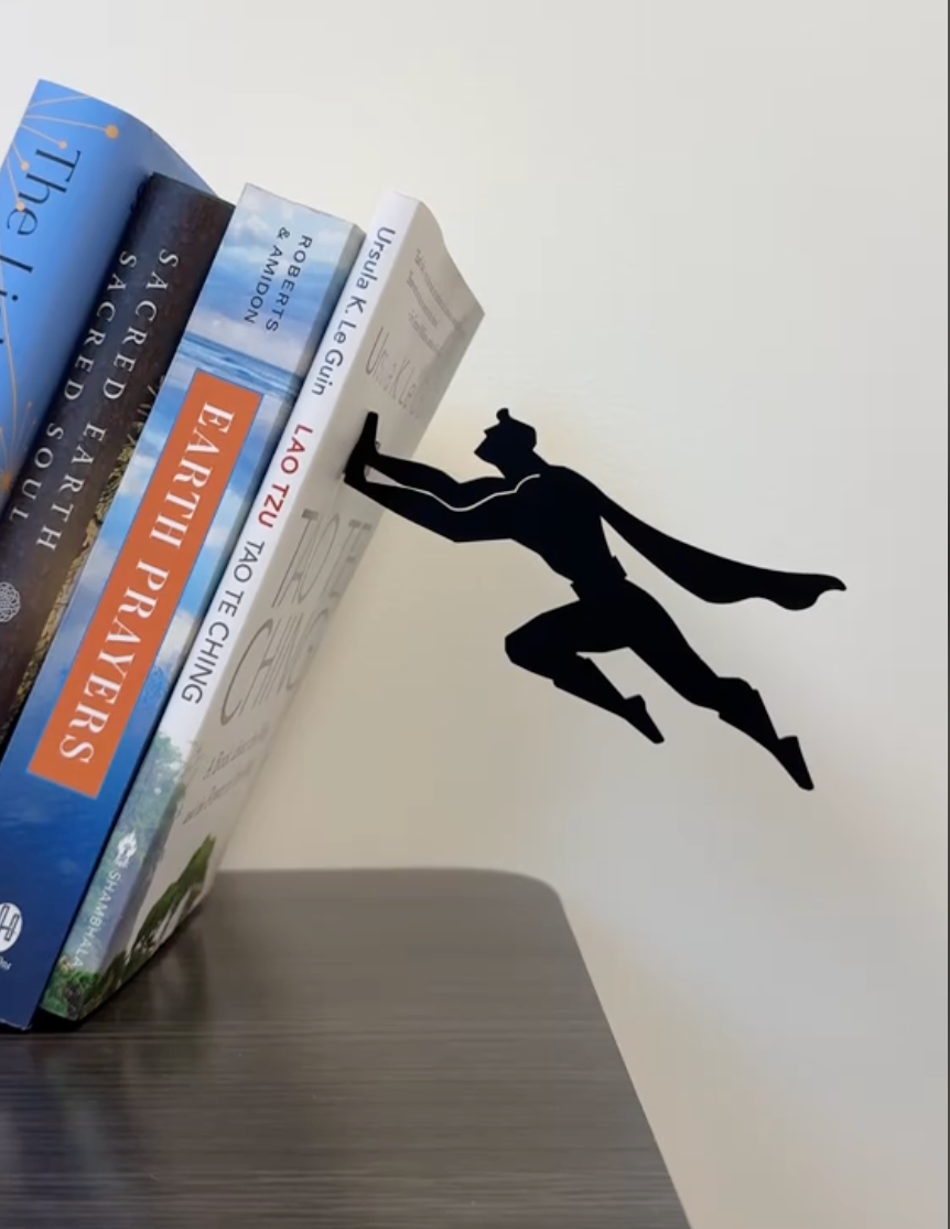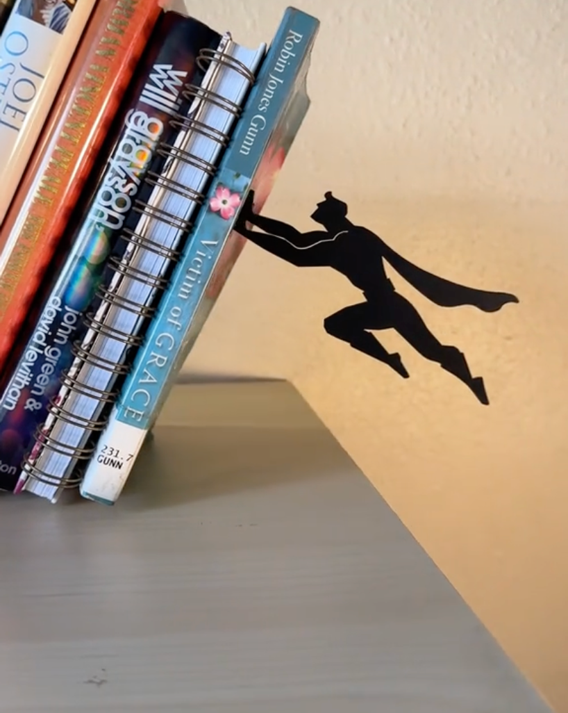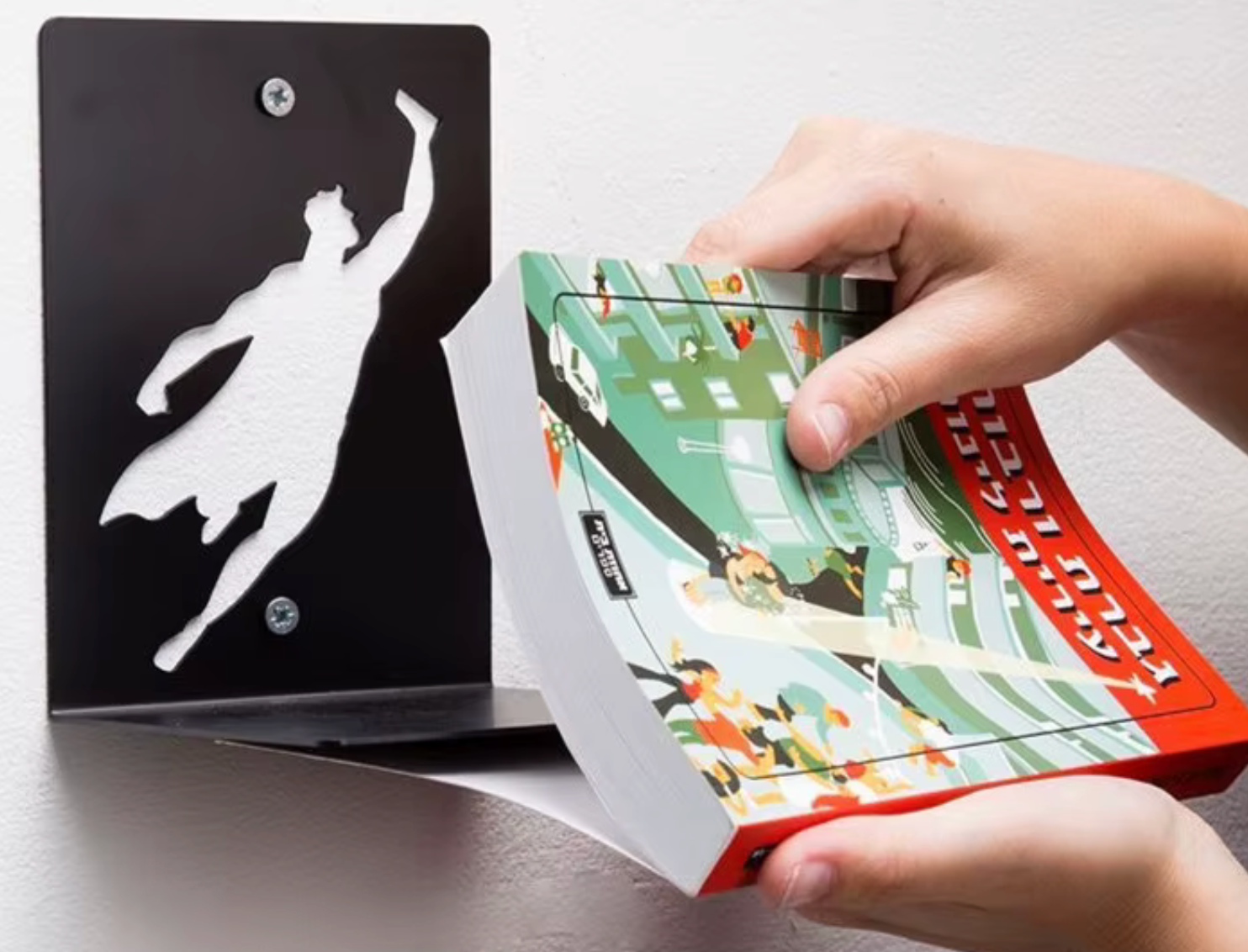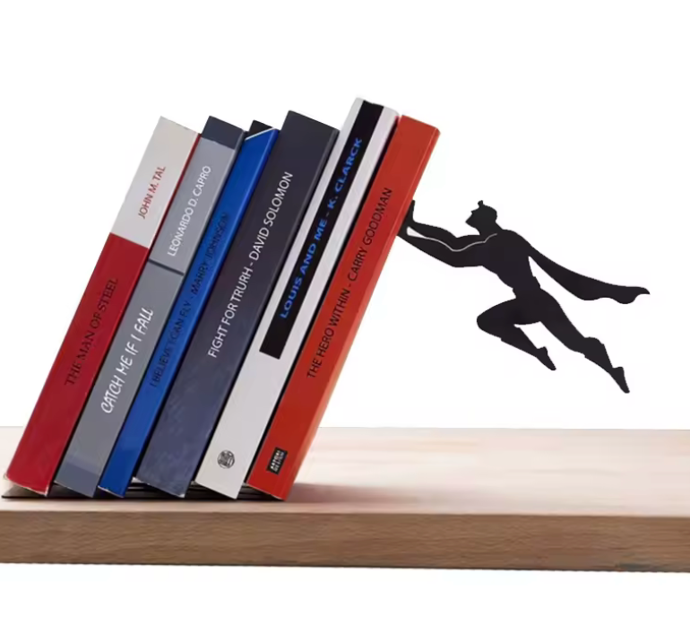Unser kreatives Buchregal sieht aus, als würde ein fliegender Superheld Ihre Bücher vor dem Umfallen bewahren. Der Trick: Ein versteckter Magnet hält das Cover des ersten Buches sicher an der Superheldenfigur fest, wodurch die Illusion entsteht, dass er die Bücher mit bloßer Kraft stützt.